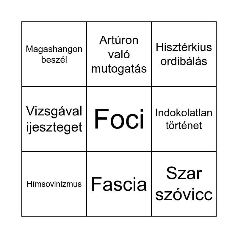 This bingo card has a free space and 32 words: Ijja ijja ó, 428 pontosok, Hrabal, Star wars, Sör, Hímsovinizmus, Szar szóvicc, Párkapcsolat, Artúron való mutogatás, Tugedör tugedör tádzsmáhál, Fascia, Hisztérkius ordibálás, Mikor legyen szünet?, Egy jó tanács, Igyanak egy kávét, Sharon Stone, Lionel Messi, A nyúlon túl, Eltöri a krétát, Rajz, Táblával hülyéskedik, AC/DC, Katarzis, Egy könnycsepp, Éneklés, Vizsgával ijeszteget, Forrás nem látszik, Indokolatlan történet, Magashangon beszél, Kedves gyerekek, Mélypont and "A feleségem...".