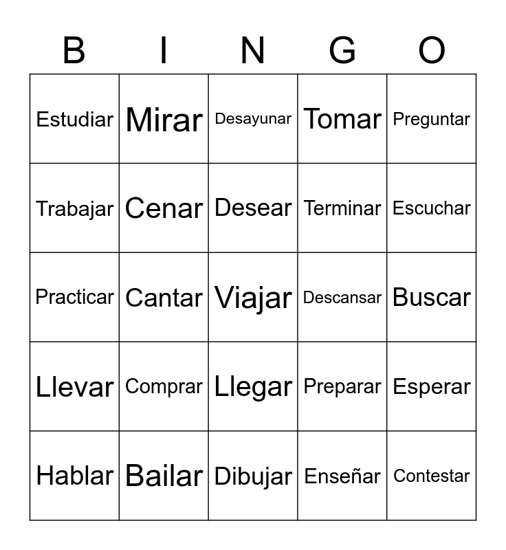 This bingo card has a free space and 29 words: Hablar, Conversar, Cantar, Caminar, Estudiar, Desayunar, Cenar, Comprar, Descansar, Bailar, Buscar, Contestar, Dibujar, Enseñar, Escuchar, Explicar, Llegar, Llevar, Preguntar, Practicar, Preparar, Regresar, Terminar, Trabajar, Tomar, Mirar, Esperar, Desear and Necesitar.