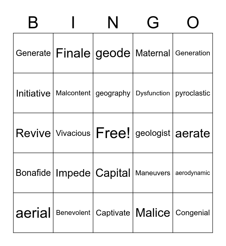 This bingo card has a free space and 58 words: Benefit, Benevolent, Benign, Bonafide, Malice, Malign, Malcontent, Malfunction, Dysfunction, Dysentery, Maternal, Matron, Matriarchy, Patrician, Patriarchal, Generate, Congenial, Generation, Genetic, geography, geologist, geode, aerial, aerodynamic, aerobic, aerate, pyrotechnics, pyromania, pyroclastic, Native, Nationality, Innate, Mortality, Mortuary, Mortify, Mortal, Vital, Vivacious, Revive, Pedestal, Impede, Pedestrians, Maneuvers, Manuscript, Manipulate, Manual, Capitulate, Capital, Captivate, Terminology, Terminal, Terminate, Finite, Confine, Finale, Initiate, Initiative and Initial.