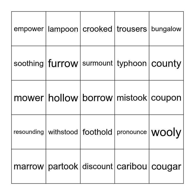 This bingo card has 25 words: withstood, discount, surmount, marrow, bungalow, empower, soothing, lampoon, mistook, foothold, typhoon, mower, pronounce, wooly, furrow, cougar, coupon, crooked, county, hollow, borrow, partook, resounding, trousers and caribou.