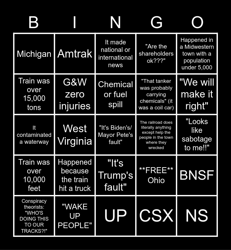 This bingo card has 25 words: Happened because the train hit a truck, UP, Chemical or fuel spill, Conspiracy theorists: "WHO'S DOING THIS TO OUR TRACKS?!", Happened in a Midwestern town with a population under 5,000, Michigan, Train was over 15,000 tons, Amtrak, The railroad does literally anything except help the people in the town where they wrecked, "It's Trump's fault", "That tanker was probably carrying chemicals" (it was a coil car), It contaminated a waterway, **FREE** Ohio, BNSF, G&W zero injuries, NS, "Looks like sabotage to me!!", It made national or international news, "We will make it right", West Virginia, "It's Biden's/ Mayor Pete's fault", "WAKE UP PEOPLE", Train was over 10,000 feet, "Are the shareholders ok???" and CSX.