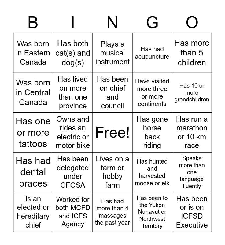 This bingo card has a free space and 24 words: Has been delegated under CFCSA, Worked for both MCFD and ICFS Agency, Has been on chief and council, Is an elected or hereditary chief, Has more than 5 children, Was born in Eastern Canada, Was born in Central Canada, Has both cat(s) and dog(s), Has gone horse back riding, Lives on a farm or hobby farm, Have visited more three or more continents, Has one or more tattoos, Has hunted and harvested moose or elk, Speaks more than one language fluently, Has lived on more than one province, Has been to the Yukon Nunavut or Northwest Territory, Has run a marathon or 10 km race, Plays a musical instrument, Has 10 or more grandchildren, Owns and rides an electric or motor bike, Has been or is on ICFSD Executive, Has had dental braces, Has had acupuncture and Has had more than 4 massages the past year.