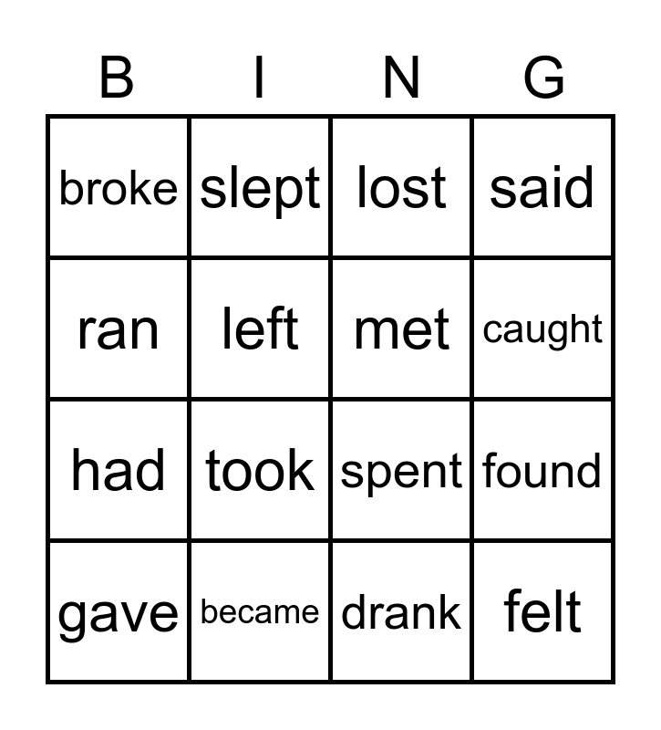 This bingo card has 16 words: became, found, lost, broke, had, slept, spent, drank, ran, left, gave, said, took, caught, met and felt.
