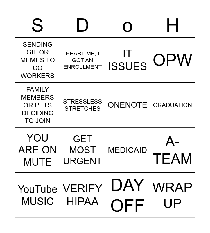 This bingo card has 16 words: VERIFY HIPAA, A-TEAM, IT ISSUES, SENDING GIF OR MEMES TO CO WORKERS, YOU ARE ON MUTE, HEART ME, I GOT AN ENROLLMENT, MEDICAID, DAY OFF, FAMILY MEMBERS OR PETS DECIDING TO JOIN, STRESSLESS STRETCHES, YouTube MUSIC, OPW, GET MOST URGENT, GRADUATION, ONENOTE and WRAP UP.