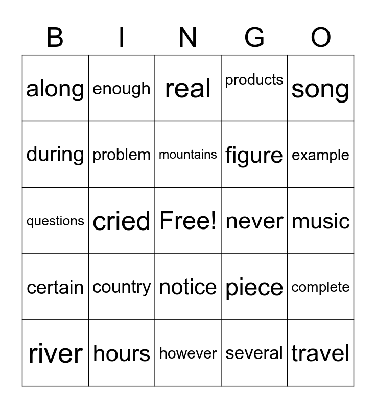 This bingo card has a free space and 24 words: river, country, mountains, several, song, along, enough, real, never, music, questions, problem, piece, complete, during, hours, however, products, example, certain, cried, notice, figure and travel.