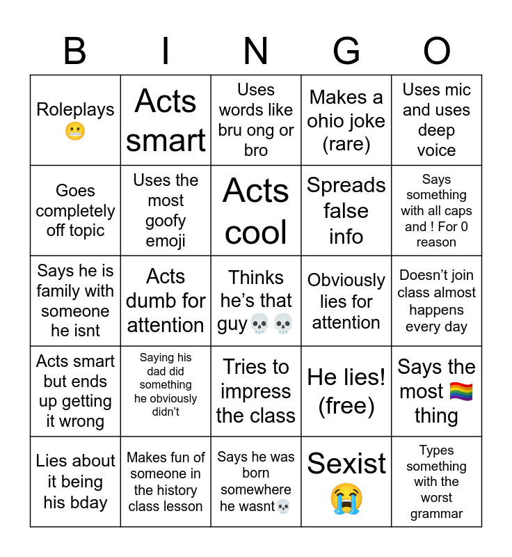 This bingo card has 25 words: Saying his dad did something he obviously didn’t, Says he was born somewhere he wasnt💀, Acts cool, Lies about it being his bday, Uses mic and uses deep voice, Roleplays😬, Goes completely off topic, Acts smart, Obviously lies for attention, Tries to impress the class, Spreads false info, Says he is family with someone he isnt, He lies!(free), Says the most 🏳️🌈 thing, Uses the most goofy emoji, Types something with the worst grammar, Doesn’t join class almost happens every day, Uses words like bru ong or bro, Says something with all caps and ! For 0 reason, Acts dumb for attention, Thinks he’s that guy💀💀, Makes fun of someone in the history class lesson, Acts smart but ends up getting it wrong, Makes a ohio joke (rare) and Sexist😭.