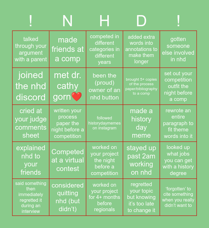 This bingo card has a free space and 24 words: Competed at a virtual contest, considered quitting nhd (but didn’t), been the (proud) owner of an nhd button, said something then immediately regretted it during an interview, gotten someone else involved in nhd, talked through your argument with a parent, joined the nhd discord, made friends at a comp, made a history day meme, worked on your project the night before a competition, brought 5+ copies of the process paper/bibliography to a comp, cried at your judge comments sheet, stayed up past 2am working on nhd, looked up what jobs you can get with a history degree, met dr. cathy gorn❤️, regretted your topic but knowing it’s too late to change it, rewrote an entire paragraph to fit theme words into it, competed in different categories in different years, set out your competition outfit the night before a comp, written your process paper the night before a competition, ‘forgotten’ to cite something when you really didn’t want to, explained nhd to your friends, added extra words into annotations to make them longer and worked on your project for 4+ months before regionals.