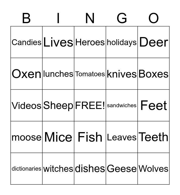 This bingo card has a free space and 42 words: Children, Tomatoes, Claves, Mice, Geese, Teeth, Wolves, Wives, Heroes, Fish, Feet, Boxes, Sheep, Deer, Scissors, Leaves, Radios, Videos, Halves, Lives, Oxen, Frogs, Babies, Candies, Celeries, classes, knives, shelves, monkeys, puppies, beaches, moose, lunches, dishes, families, dictionaries, witches, sandwiches, dominoes, windows, holidays and splashes.