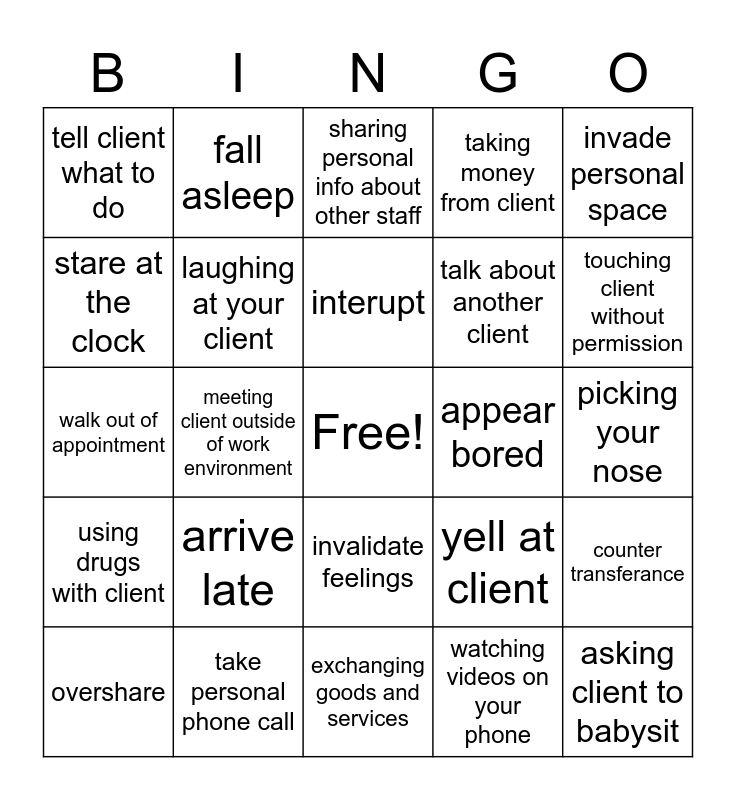 This bingo card has a free space and 24 words: arrive late, take personal phone call, interupt, overshare, invade personal space, tell client what to do, stare at the clock, fall asleep, appear bored, invalidate feelings, talk about another client, walk out of appointment, yell at client, counter transferance, laughing at your client, watching videos on your phone, picking your nose, sharing personal info about other staff, touching client without permission, meeting client outside of work environment, asking client to babysit, using drugs with client, taking money from client and exchanging goods and services.