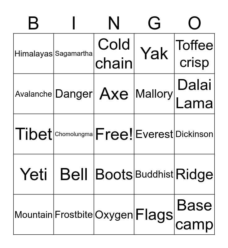 This bingo card has a free space and 37 words: Blizzard, Courage, Tensing, Danger, Ridge, Bell, Axe, Crevasse, Toffee crisp, Peak, Chomolungma, Yak, Base camp, Dickinson, Avalanche, Yeti, Summit, Cold chain, Boots, Everest, Himalayas, Dalai Lama, Mountain, Oxygen, Sherpa, Flags, Sagamartha, Leopard, Boots, Thermal, Glacier, Frostbite, Tibet, Nepal, Buddhist, Mallory and winter.