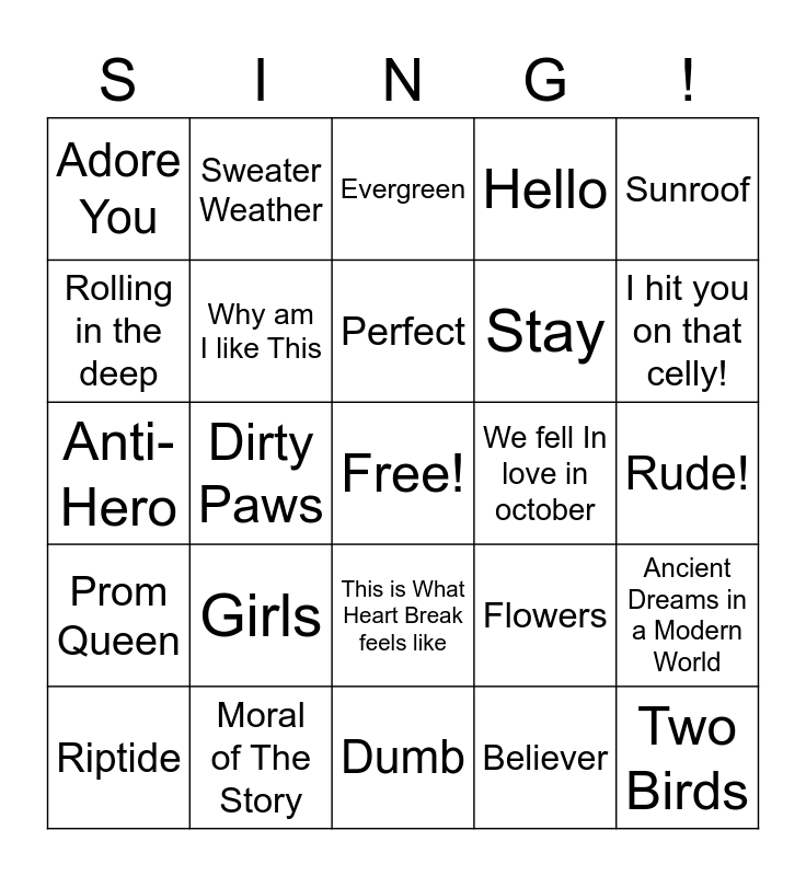 This bingo card has a free space and 29 words: Riptide, In the name of Love, Dirty Paws, Animal Within Me, Adore You, Evergreen, Why am I like This, Girls, We fell In love in october, Moral of The Story, Rude!, Two Birds, Dumb, Believer, I hit you on that celly!, Golden Hour, This is What Heart Break feels like, Prom Queen, Sunroof, Anti-Hero, Flowers, As it Was, Stay, Rolling in the deep, Hello, Sweater Weather, Ancient Dreams in a Modern World, Perfect and Shape of you.