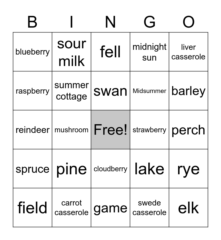 This bingo card has a free space and 38 words: dandelion, northern lights, viper, summer cottage, rye, pine, swan, moose, liver casserole, Midsummer, mushroom, midnight sun, elk, perch, raspberry, spruce, cinnamon bun, fell, lynx, strawberry, blueberry, carrot casserole, barley, field, archipelago, game, oatmeal, forest, squirrel, national anthem, Karelian pasty, cloudberry, swede casserole, sour milk, stove, lake, reindeer and birch.