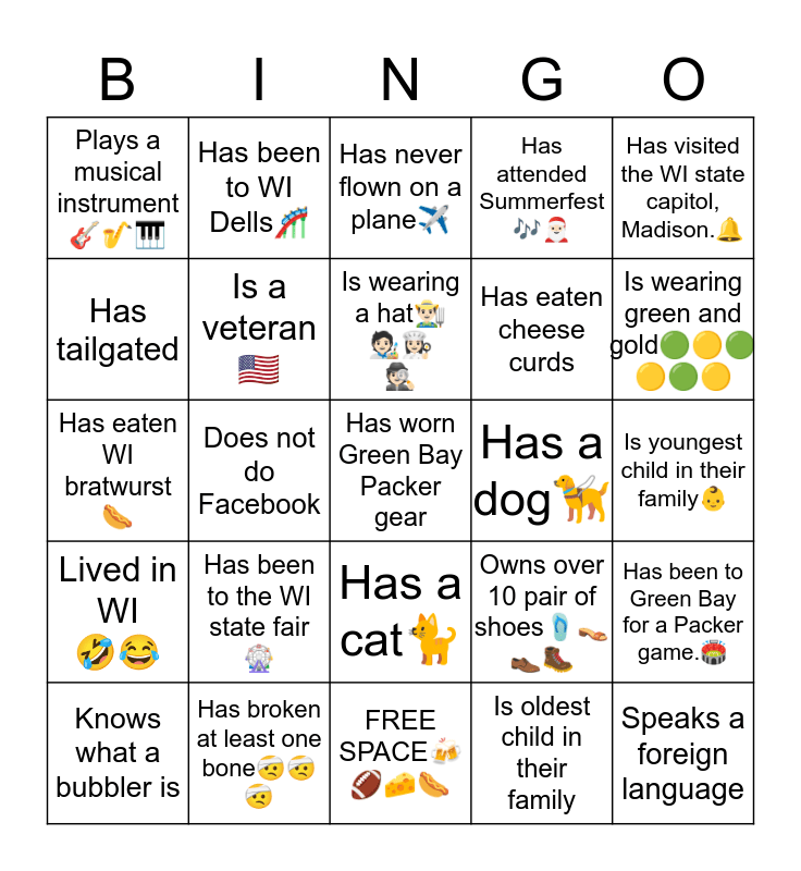 This bingo card has 25 words: Lived in WI 🤣😂, Has broken at least one bone🤕🤕🤕, Has worn Green Bay Packer gear, Is oldest child in their family, Has visited the WI state capitol, Madison.🔔, Plays a musical instrument🎸🎷🎹, Has been to WI Dells🎢, Has never flown on a plane✈️, Has a dog🦮, Has been to Green Bay for a Packer game.🏟️, Has tailgated, Is a veteran🇺🇸, FREE SPACE🍻🏈🧀🌭, Owns over 10 pair of shoes🩴👡👞🥾, Is wearing green and gold🟢🟡🟢🟡🟢🟡, Knows what a bubbler is, Does not do Facebook, Is wearing a hat👨🏻🌾🧑🏻🎨👩🏻🍳🕵🏻, Has eaten cheese curds, Is youngest child in their family👶, Has eaten WI bratwurst🌭, Has been to the WI state fair🎡, Has a cat🐈, Has attended Summerfest 🎶🎅🏻 and Speaks a foreign language.