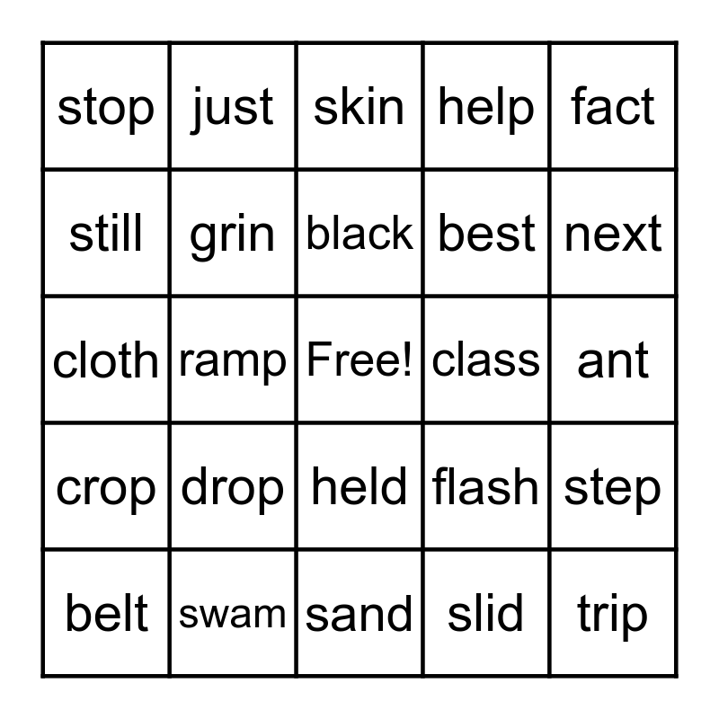 This bingo card has a free space and 24 words: drop, swam, black, belt, fact, stop, still, just, class, held, best, cloth, flash, step, grin, slid, ant, skin, next, ramp, trip, crop, help and sand.