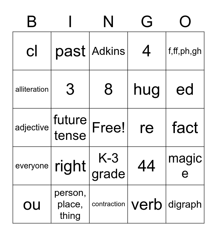 This bingo card has a free space and 24 words: ou, right, 8, verb, f,ff,ph,gh, cl, past, Adkins, re, fact, adjective, 3, 44, magic e, alliteration, person, place, thing, contraction, 4, ed, everyone, future tense, K-3 grade, hug and digraph.