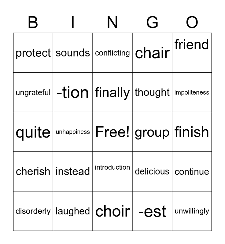 This bingo card has a free space and 24 words: instead, laughed, finally, disorderly, friend, protect, ungrateful, sounds, group, introduction, thought, quite, delicious, continue, -tion, -est, finish, conflicting, impoliteness, unhappiness, unwillingly, cherish, chair and choir.