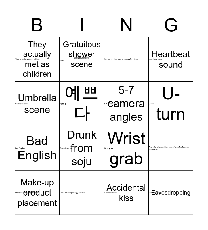 This bingo card has 16 images and 13 words: They actually met as children, Bad English, Gratuitous shower scene, Wrist grab, Accidental kiss, Umbrella scene, 예쁘다, Make-up product placement, Heartbeat sound, Drunk from soju, U-turn, 5-7 camera angles and Eavesdropping.