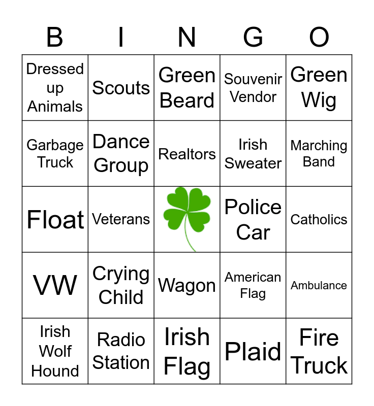 This bingo card has a free space and 44 words: Redhead, Fire Truck, Bagpiper, Irish Wolf Hound, Kilt, Plaid, Green Beard, Candy, Green Wig, Radio Station, Souvenir Vendor, Police Car, Wagon, Crying Child, Balloon, Irish Flag, Step Dancer, Float, Bicycle, Marching Band, Scouts, Green Sunglasses, Pot of Gold, Dressed up Animals, Fireman, Catholics, Politicians, Seeing Eye Dogs, American Flag, VW, Rainbow, Ambulance, Convertible, Dancer, Veterans, Someone on Crutches, Big Hat, Clown, Realtors, Garbage Truck, Irish Sweater, Baby Stroller, Dance Group and Mascot.