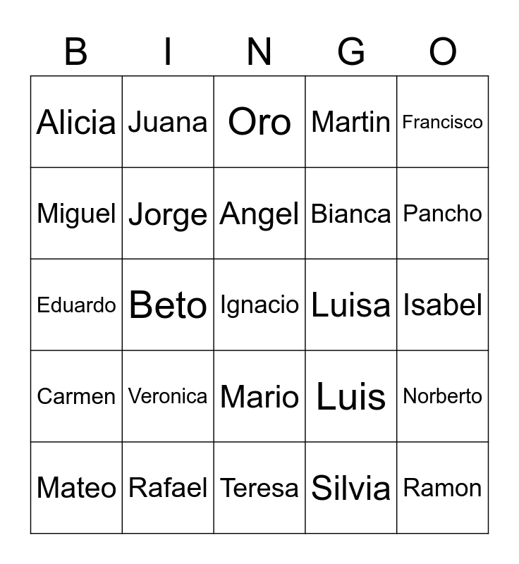 This bingo card has 35 words: Jaime, Javier, Jesus, Jorge, Mario, Martin, Miguel, Diego, Angel, Margarita, Eduardo, Francisco, Gilberto, Ana, Alicia, Luisa, Silvia, Beto, Carmen, Ignacio, Luis, Mateo, Norberto, Rafael, Oro, Pancho, Ramon, Sofia, Bianca, Isabel, Josefina, Teresa, Veronica, Juana and Leticia.