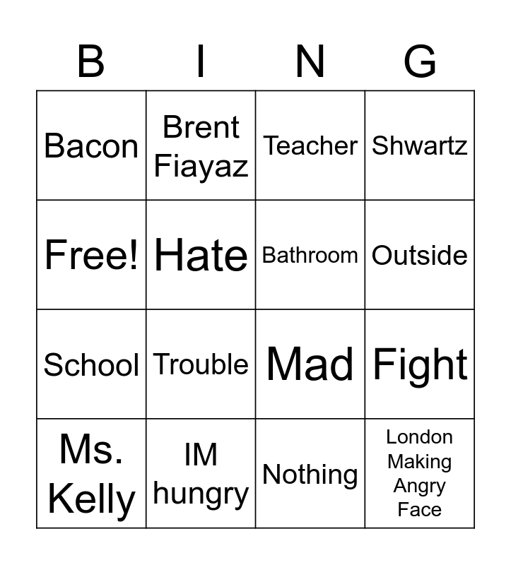 This bingo card has 16 words: IM hungry, Fight, Teacher, Bacon, School, Brent Fiayaz, Mad, Nothing, Free!, Hate, Ms. Kelly, Shwartz, Trouble, Outside, Bathroom and London Making Angry Face.