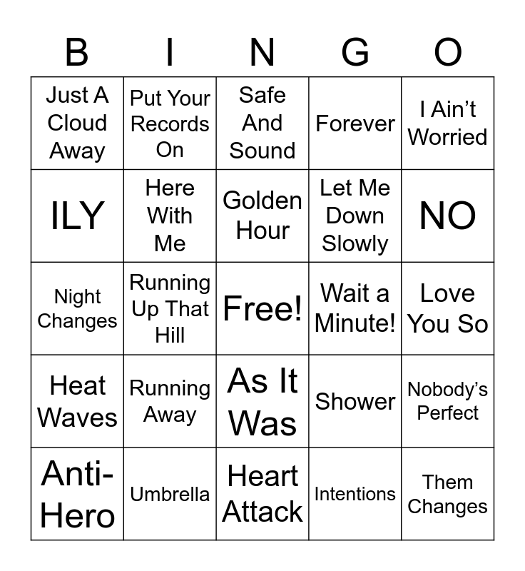 This bingo card has a free space and 39 words: Until I Found You, Flowers, Sure Thing, Here With Me, Anti-Hero, As It Was, Golden Hour, Sunroof, I Ain’t Worried, Heat Waves, Running Up That Hill, Forever, Them Changes, Love You So, Wait a Minute!, Running Away, Electric Love, Just A Cloud Away, Good 4 You, Shower, ILY, Heart Attack, Let Me Down Slowly, NO, Snowman, In the Name of Love, Levitating, Don’t Start Now, Rain On Me, Put Your Records On, Oh No, oh no no no no no, Love Story, Safe And Sound, Umbrella, Intentions, Stereo Hearts, Nobody’s Perfect, Night Changes and All Your’n.