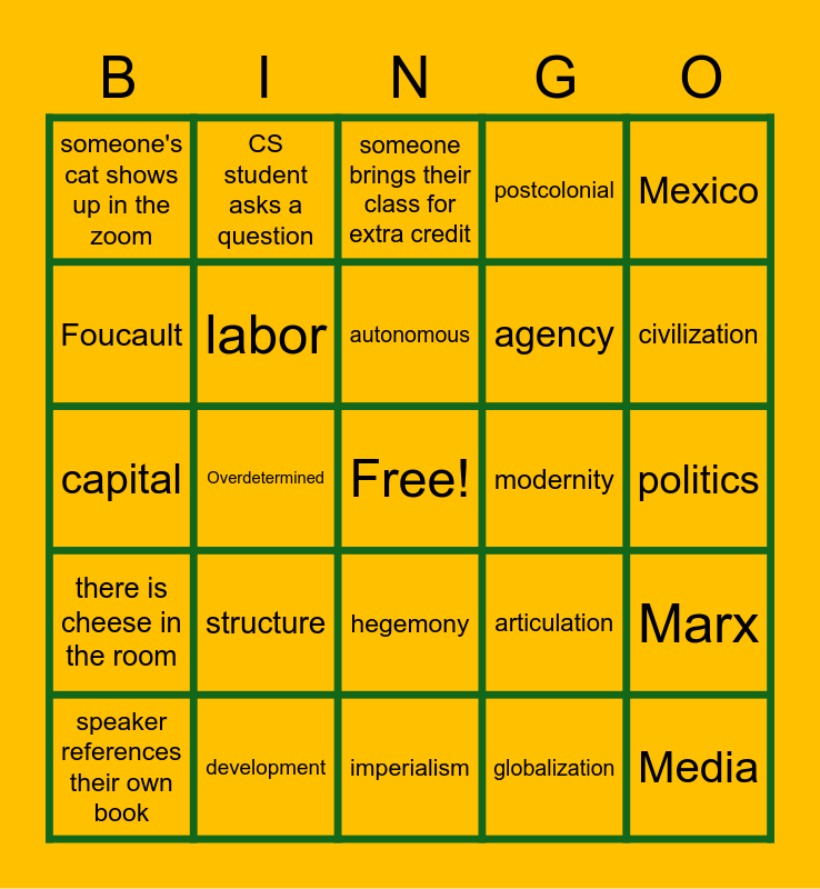 This bingo card has a free space and 35 words: justice, CS faculty asks a question, agency, postcolonial, Marx, capital, labor, imperialism, agency, resistance, there is cheese in the room, CS student asks a question, Zoom technology doesn't work, power, someone's cat shows up in the zoom, structure, imperialism, modernity, politics, speaker references their own book, development, someone brings their class for extra credit, globalization, Media, Foucault, Overdetermined, hegemony, colonization, civilization, society, dialectical, autonomous, articulation, Mexico and exploitation.