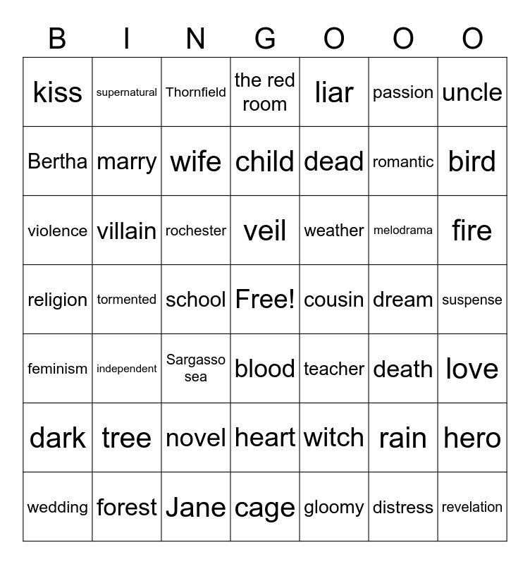 This bingo card has a free space and 53 words: Jane, romantic, isolation, school, rochester, love, supernatural, master, passion, dark, uncle, teacher, melodrama, weather, rain, fire, Bertha, bird, cage, liar, dead, revelation, marry, kiss, gloomy, religion, feminism, distress, suspense, wife, horse, blood, witch, hero, death, independent, the red room, tormented, Thornfield, tree, novel, heart, violence, patriarchy, wedding, veil, dream, Sargasso sea, child, villain, forest, cousin and reveal.