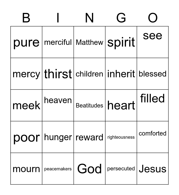 This bingo card has a free space and 26 words: reward, persecuted, children, peacemakers, see, pure, mercy, merciful, filled, righteousness, inherit, meek, comforted, mourn, heaven, kingdom, spirit, poor, Matthew, Jesus, blessed, God, heart, hunger, thirst and rejoice.