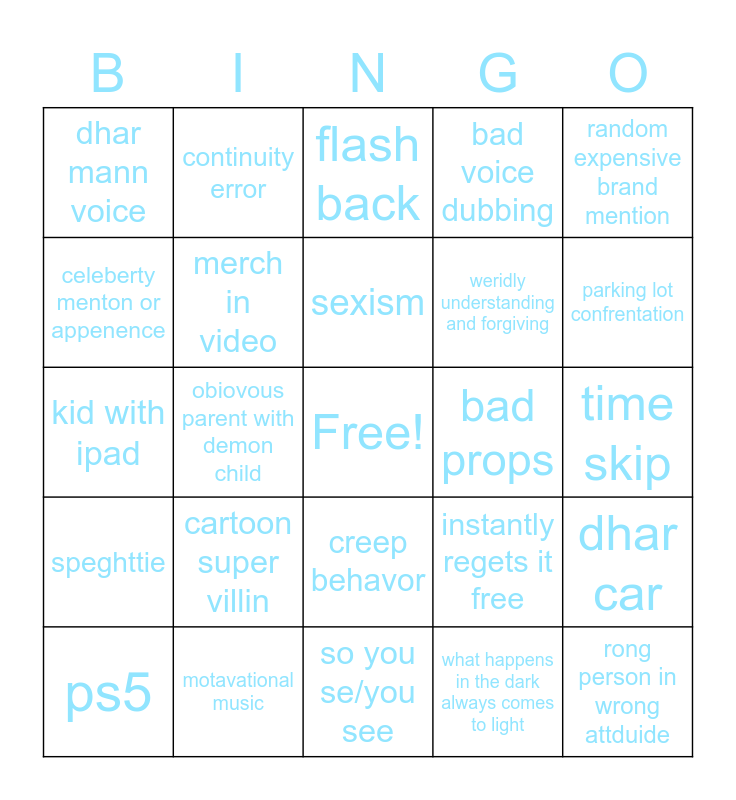 This bingo card has a free space and 25 words: cartoon super villin, so you se/you see, sexism, ps5, random expensive brand mention, dhar mann voice, celeberty menton or appenence, continuity error, bad props, creep behavor, weridly understanding and forgiving, kid with ipad, instantly regets it free, dhar car, merch in video, what happens in the dark always comes to light, time skip, flash back, parking lot confrentation, obiovous parent with demon child, rong person in wrong attduide, motavational music, speghttie, bad voice dubbing and what happens in the dark always comes to light.