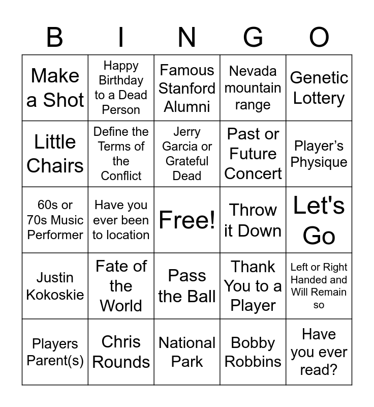 This bingo card has a free space and 25 words: Fate of the World, National Park, Jerry Garcia or Grateful Dead, Players Parent(s), Genetic Lottery, Make a Shot, Little Chairs, Happy Birthday to a Dead Person, Throw it Down, Pass the Ball, Past or Future Concert, 60s or 70s Music Performer, Thank You to a Player, Left or Right Handed and Will Remain so, Define the Terms of the Conflict, Another Time Out?, Let's Go, Famous Stanford Alumni, Player’s Physique, Have you ever been to location, Have you ever read?, Chris Rounds, Justin Kokoskie, Nevada mountain range and Bobby Robbins.
