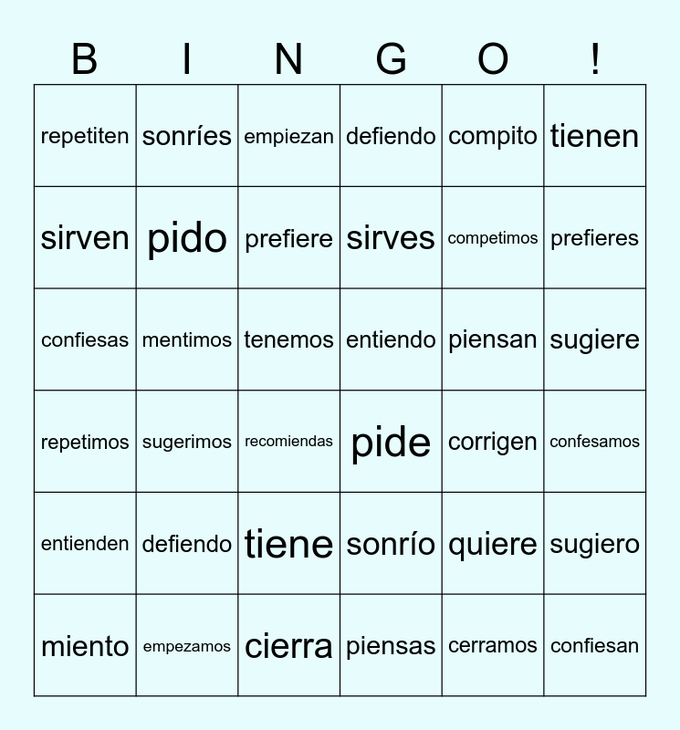 This bingo card has 36 words: sonrío, tiene, piensas, sirven, repetimos, entiendo, pido, cierra, compito, quiere, prefieres, defiendo, sugiero, mentimos, sirves, repetiten, entienden, piensan, confiesas, empiezan, tenemos, sugerimos, pide, recomiendas, corrigen, sonríes, competimos, empezamos, prefiere, tienen, confiesan, miento, confesamos, sugiere, defiendo and cerramos.