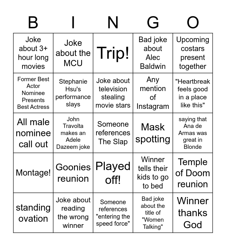 This bingo card has a free space and 34 words: "Angela Bassett did the thing", Bad joke about the title of "Women Talking", Jimmy didn't see one of the nominees, Presenter or winner asks to be cast in Knives Out 3, Montage!, Stephanie Hsu's performance slays, Upcoming costars present together, standing ovation, Joke about the MCU, Awkward crowd work, Joke about television stealing movie stars, Trip!, Elvis voice, In Memoriam leaves someone out, Mask spotting, "Heartbreak feels good in a place like this", Joke about reading the wrong winner, All male nominee call out, Goonies reunion, Winner tells their kids to go to bed, Played off!, Bad joke about "The Whale", Joke about 3+ hour long movies, saying that Ana de Armas was great in Blonde, Someone references "entering the speed force", Winner thanks God, Bad joke about Alec Baldwin, All white nominee call out, Any mention of Instagram, Former Best Actor Nominee Presents Best Actress, "The dictionary defines...", John Travolta makes an Adele Dazeem joke, Temple of Doom reunion and Camera cuts to Andrea Riseborough.