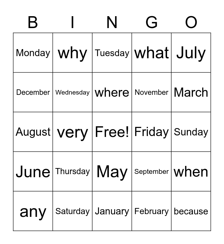 This bingo card has a free space and 29 words: any, many, very, every, Monday, Tuesday, Wednesday, Thursday, Friday, Saturday, Sunday, because, January, February, March, April, May, June, July, August, September, October, November, December, what, why, when, where and how.
