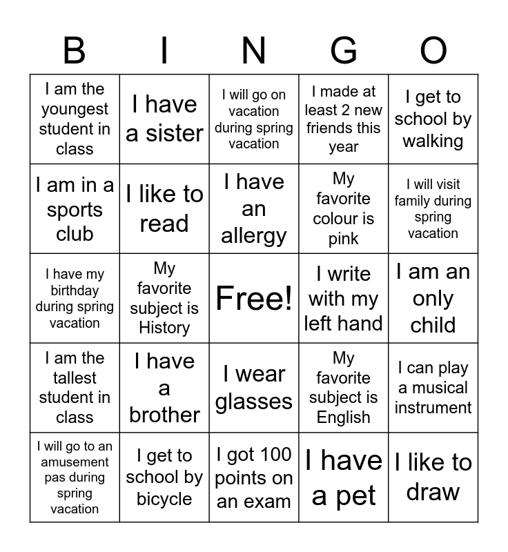 This bingo card has a free space and 24 words: I have a brother, I get to school by bicycle, I have an allergy, I will go to an amusement pas during spring vacation, I get to school by walking, I am the youngest student in class, I am in a sports club, I have a sister, I write with my left hand, I wear glasses, My favorite colour is pink, I have my birthday during spring vacation, My favorite subject is English, I can play a musical instrument, I like to read, I have a pet, I am an only child, I will go on vacation during spring vacation, I will visit family during spring vacation, My favorite subject is History, I like to draw, I am the tallest student in class, I made at least 2 new friends this year and I got 100 points on an exam.