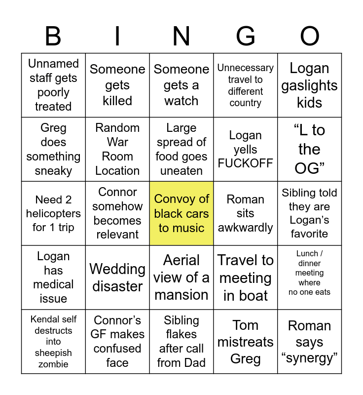This bingo card has a free space and 24 words: Wedding disaster, Connor’s GF makes confused face, Large spread of food goes uneaten, Kendal self destructs into sheepish zombie, Logan gaslights kids, Unnamed staff gets poorly treated, Greg does something sneaky, Someone gets killed, Roman sits awkwardly, Aerial view of a mansion, Logan yells FUCKOFF, Need 2 helicopters for 1 trip, Travel to meeting in boat, Lunch / dinner meeting where no one eats, Random War Room Location, Tom mistreats Greg, Sibling told they are Logan’s favorite, Someone gets a watch, “L to the OG”, Connor somehow becomes relevant, Roman says “synergy”, Logan has medical issue, Unnecessary travel to different country and Sibling flakes after call from Dad.