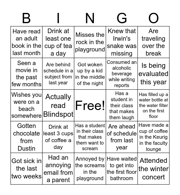 This bingo card has a free space and 24 words: Drink at least 3 cups of coffee a day, Had an annoying email from a parent, Got woken up by a kid in the middle of the night, Got sick in the last two weeks, Are traveling over the break, Have read an adult book in the last month, Seen a movie in the past few months, Drink at least one cup of tea a day, Has a student in their class that makes them laugh, Has a student in their class that makes them want to scream, Consumed an alcoholic beverage while writing reports, Wishes you were on a beach somewhere, Are ahead of schedule from last year, Have made a cup of coffee in the Keurig in the faculty lounge, Are behind schedule in a subject from last year, Have waited to get into the first floor bathroom, Has filled up a water bottle at the water filter on the first floor, Misses the rock in the playground, Is being evaluated this year, Actually read Blindspot, Attended the winter concert, Gotten chocolate from Dustin, Knew that Irwin's snake was missing and Annoyed by the screams in the playground.