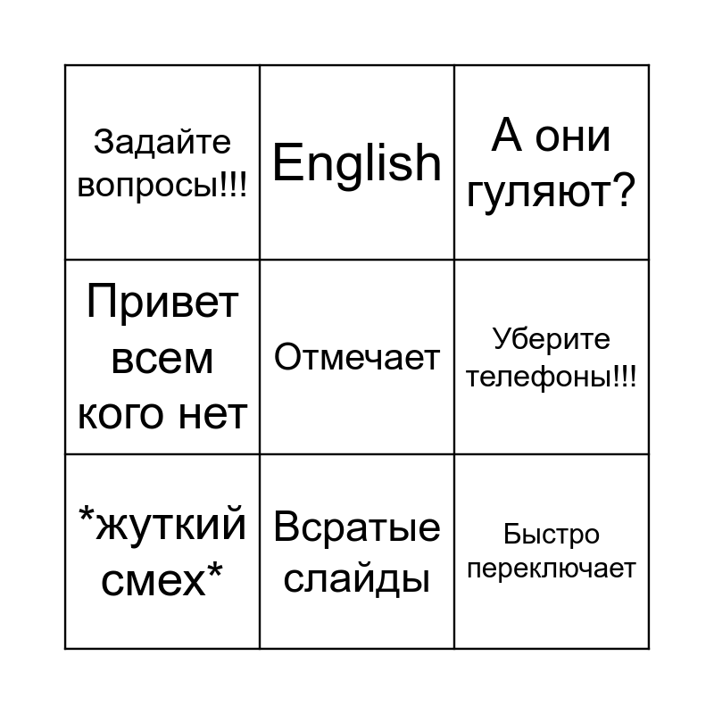 This bingo card has 9 words: *жуткий смех*, А они гуляют?, English, Привет всем кого нет, Задайте вопросы!!!, Уберите телефоны!!!, Отмечает, Быстро переключает and Всратые слайды.