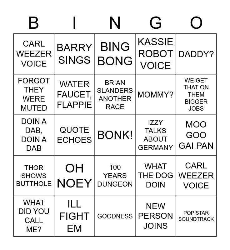 This bingo card has a free space and 27 words: WHAT THE DOG DOIN, FORGOT TO TAKE A DAB, MOMMY?, GOODNESS, FORGOT THEY WERE MUTED, BING BONG, BARRY SINGS, THOR SHOWS BUTTHOLE, IZZY TALKS ABOUT GERMANY, CARL WEEZER VOICE, DOIN A DAB, DOIN A DAB, KASSIE ROBOT VOICE, WHAT DID YOU CALL ME?, ILL FIGHT EM, WE GET THAT ON THEM BIGGER JOBS, BOWIE HURTS IG, WATER FAUCET, FLAPPIE, BRIAN SLANDERS ANOTHER RACE, OH NOEY, CARL WEEZER VOICE, MOO GOO GAI PAN, NEW PERSON JOINS, QUOTE ECHOES, POP STAR SOUNDTRACK, 100 YEARS DUNGEON, DADDY? and WHERES MY VAPE?.