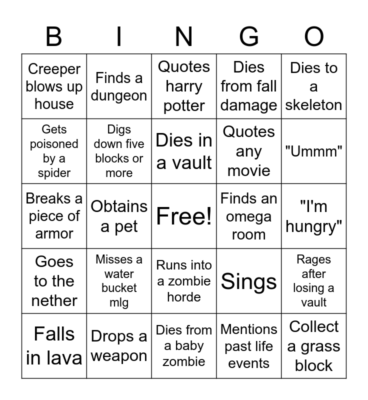 This bingo card has a free space and 24 words: Misses a water bucket mlg, Drops a weapon, Dies in a vault, Falls in lava, Dies to a skeleton, Creeper blows up house, Gets poisoned by a spider, Finds a dungeon, Finds an omega room, Runs into a zombie horde, Quotes any movie, Breaks a piece of armor, Sings, Rages after losing a vault, Digs down five blocks or more, Mentions past life events, "I'm hungry", Quotes harry potter, "Ummm", Obtains a pet, Collect a grass block, Goes to the nether, Dies from fall damage and Dies from a baby zombie.