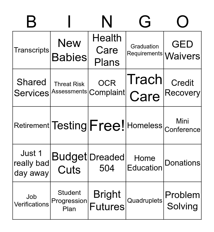 This bingo card has a free space and 24 words: Budget Cuts, Student Progression Plan, OCR Complaint, Job Verifications, GED Waivers, Transcripts, Shared Services, New Babies, Homeless, Dreaded 504, Trach Care, Retirement, Home Education, Donations, Threat Risk Assessments, Quadruplets, Mini Conference, Health Care Plans, Credit Recovery, Testing, Problem Solving, Just 1 really bad day away, Graduation Requirements and Bright Futures.