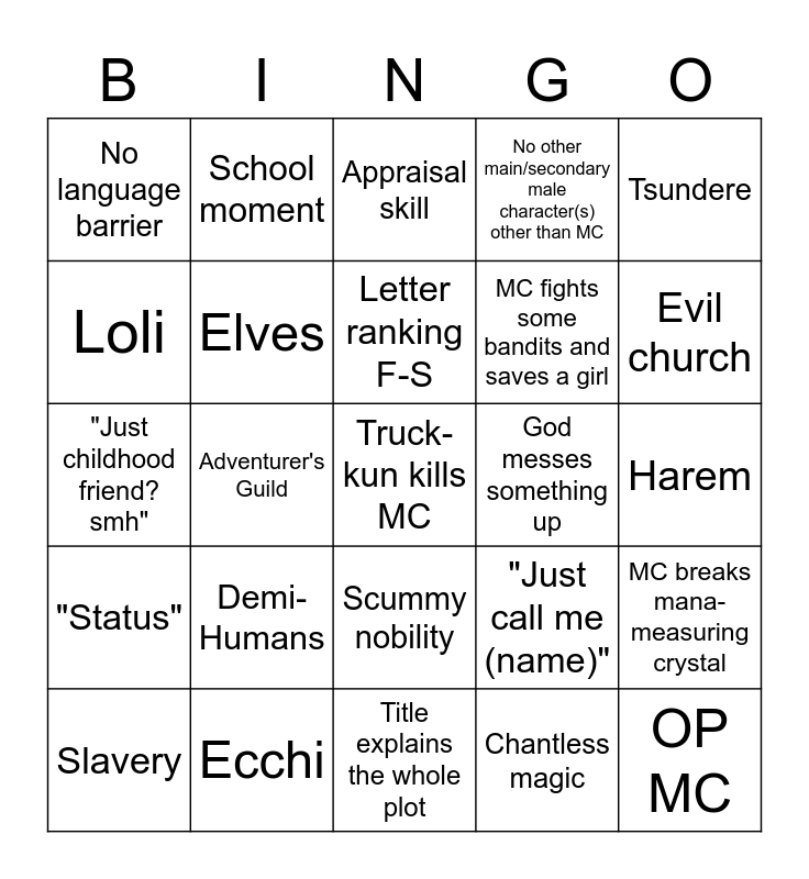 This bingo card has 29 words: Slavery, Oblivious to flirting, Adventurer's Guild, OP MC, No language barrier, Appraisal skill, Elves, Demi-Humans, God messes something up, Ecchi, Harem, Truck-kun kills MC, Title explains the whole plot, Chantless magic, Evil church, Corrupt royals, Scummy nobility, "Status", Tsundere, "Just childhood friend? smh", "Just call me (name)", MC learns everything 100x quicker than normal, MC fights some bandits and saves a girl, Loli, No other main/secondary male character(s) other than MC, School moment, MC breaks mana-measuring crystal, Letter ranking F-S and Currency is copper, silver, gold and holy/platinum coins.