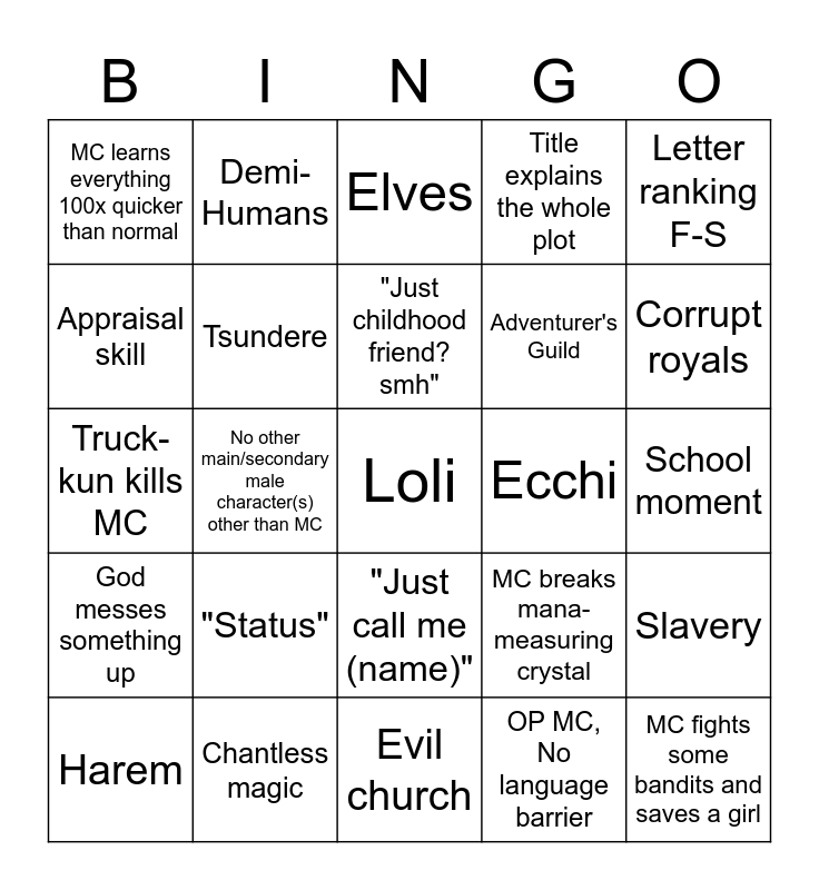 This bingo card has 28 words: Slavery, Oblivious to flirting, Adventurer's Guild, OP MC, No language barrier, Appraisal skill, Elves, Demi-Humans, God messes something up, Ecchi, Harem, Truck-kun kills MC, Title explains the whole plot, Chantless magic, Evil church, Corrupt royals, Scummy nobility, "Status", Tsundere, "Just childhood friend? smh", "Just call me (name)", MC learns everything 100x quicker than normal, MC fights some bandits and saves a girl, Loli, No other main/secondary male character(s) other than MC, School moment, MC breaks mana-measuring crystal, Letter ranking F-S and Currency is copper, silver, gold and holy/platinum coins..