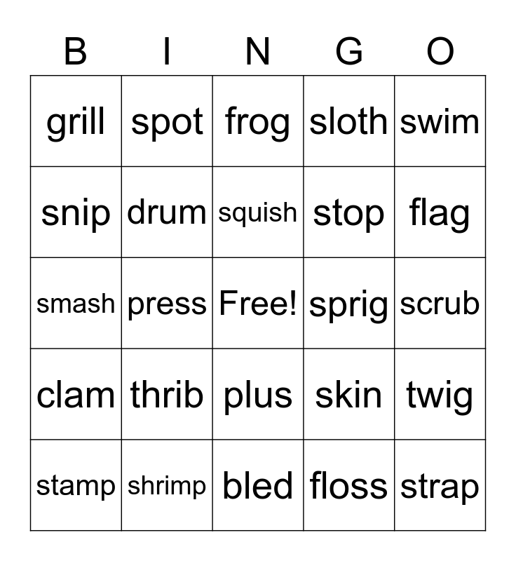 This bingo card has a free space and 29 words: stamp, trap, press, brush, grill, frog, drum, thrib, sprig, shrimp, scrub, strap, bled, floss, flag, glad, plus, clam, swim, smash, skin, scan, stop, snip, sloth, spot, twig, squish and trip.