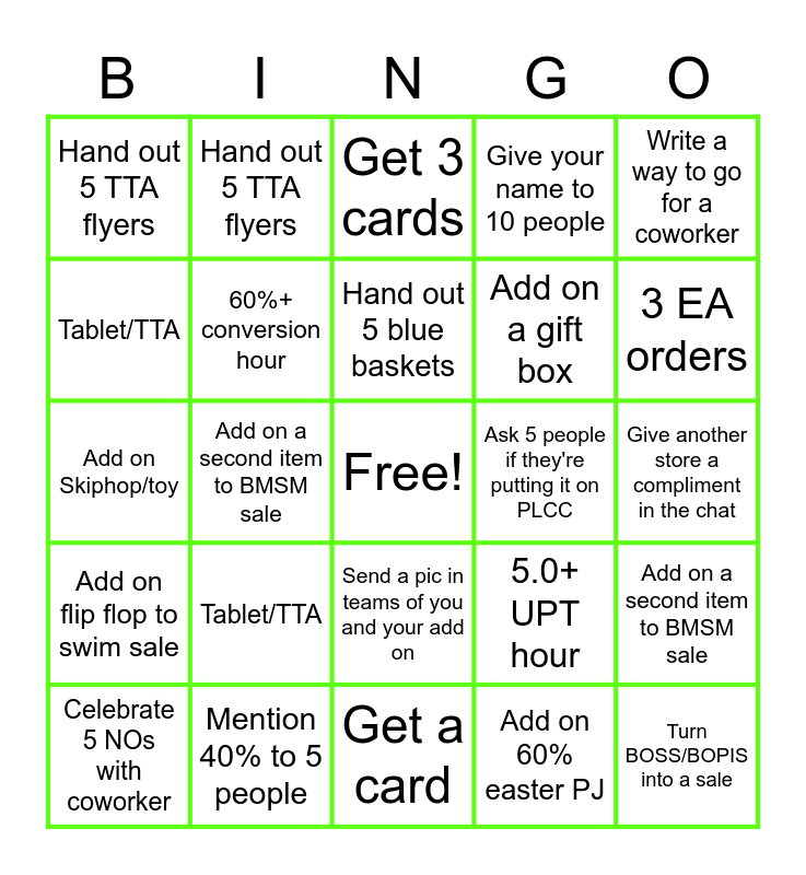 This bingo card has a free space and 24 words: Tablet/TTA, Mention 40% to 5 people, Hand out 5 blue baskets, Celebrate 5 NOs with coworker, Write a way to go for a coworker, Hand out 5 TTA flyers, Tablet/TTA, Hand out 5 TTA flyers, Ask 5 people if they're putting it on PLCC, Send a pic in teams of you and your add on, Add on a gift box, Add on Skiphop/toy, 5.0+ UPT hour, Add on a second item to BMSM sale, 60%+ conversion hour, Add on 60% easter PJ, Give another store a compliment in the chat, Get 3 cards, 3 EA orders, Add on a second item to BMSM sale, Turn BOSS/BOPIS into a sale, Add on flip flop to swim sale, Give your name to 10 people and Get a card.