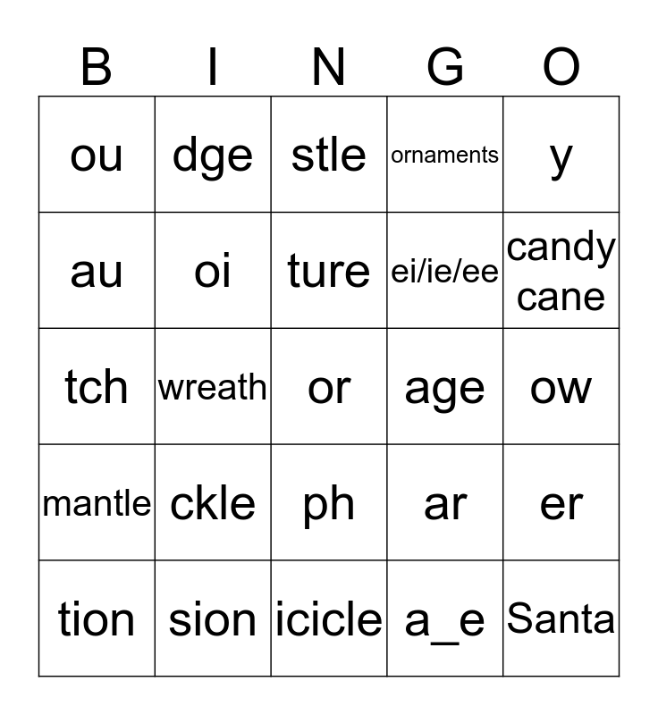 This bingo card has a free space and 24 words: ckle, sion, ture, tion, y, ou, au, dge, age, ph, ei/ie/ee, tch, ar, er, oi, a_e, ow, stle, candy cane, wreath, Santa, mantle, ornaments and icicle.