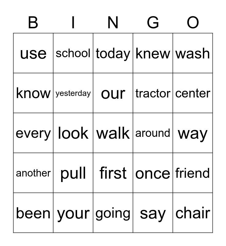 This bingo card has a free space and 30 words: your, which, look, also, use, today, yesterday, first, around, going, way, chair, say, their, center, how, once, another, pull, wash, every, everyone, school, tractor, know, knew, friend, been, our and other.
