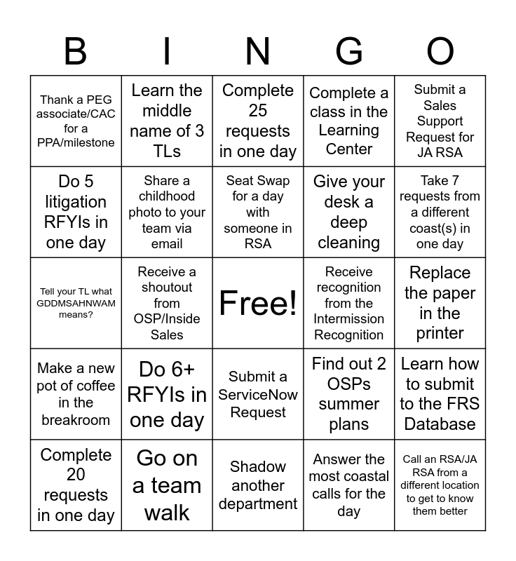 This bingo card has a free space and 41 words: Submit three stellars for peers (must be approved by TL), Tell your TL what GDDMSAHNWAM means?, Answer the most coastal calls for your team in a week, Share a childhood photo to your team via email, Go on a team walk, Submit a ServiceNow Request, Seat Swap for a day with someone in RSA, Send a digital PMP for an OSP/Inside Sales, Submit a Sales Support Request for JA RSA, Make a new pot of coffee in the breakroom, Receive a shoutout from OSP/Inside Sales, Complete a class in the Learning Center, Call an RSA/JA RSA from a different location to get to know them better, Replace the paper in the printer, Receive recognition from the Intermission Recognition, Do 6+ RFYIs in one day, Help out another coast (Take 2+ requests from another coast), Thank a PEG associate/CAC for a PPA/milestone, Submit a stellar for someone in a different department, Complete 25 requests in one day, Learn how to submit to the FRS Database, Receive a Stellar (must be approved by TL), Shadow another department, Give your desk a deep cleaning, Clear out everyone's batch, Push back on unnecessary SP request (TL approved), Answer the most coastal calls for the day, Do 5 Custodian RFYIs in one day, Take 7 requests from a different coast(s) in one day, Wear something green to work everyday for a week, Suprise a teammate with a coffee, Learn the middle name of 3 TLs, Complete 20 requests in one day, Answer all RSS calls that come in for one day, Find out 2 OSPs summer plans, Do 5 litigation RFYIs in one day, Take 5 RFYIs off your teammates plates in one day, Complete 3 time sensitive requests in one day, Find out 1 OSP/GTGs golf handicap, Bring your TL coffee and Do 10 PPAs in one day.