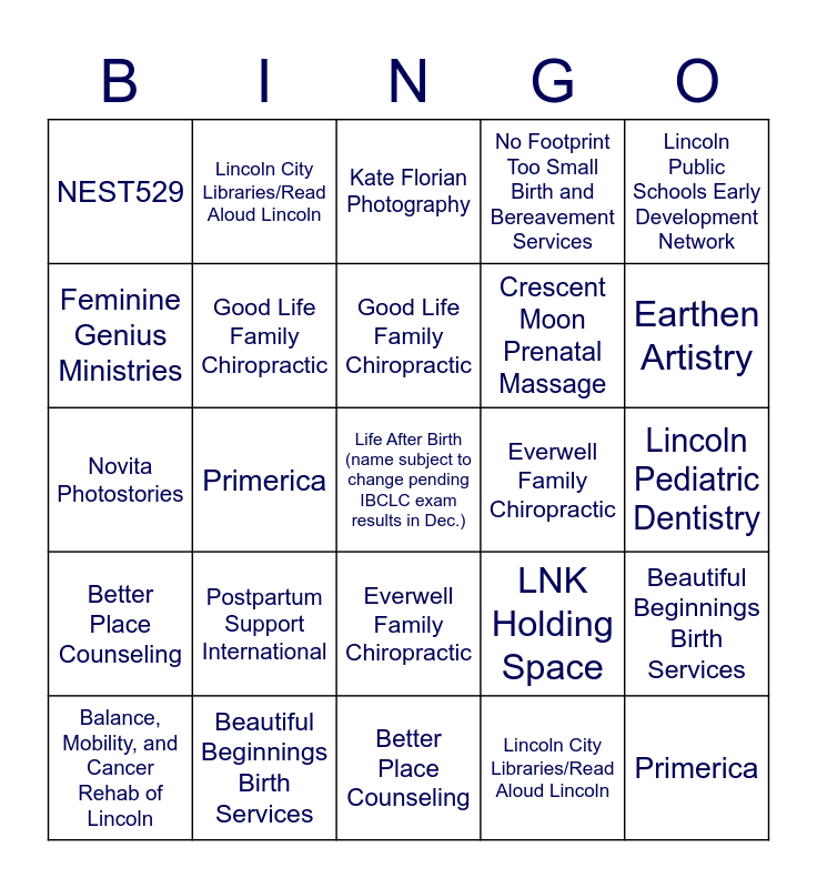 ⚠ This card has duplicate items: Becky Sherman Birth Doula (2), LNK Holding Space (2), Beautiful Beginnings Birth Services (2), CHI Health Birth Center (2), Novita Photostories (2), Lincoln City Libraries/Read Aloud Lincoln (2), MilkWorks (2), Good Life Family Chiropractic (2), Express Life Chiropractic (2), Everwell Family Chiropractic (2), Pharmacy Solutions (2), Lincoln Pediatric Dentistry (2), Lincoln Public Schools Early Development Network (2), Earthen Artistry (2), Feminine Genius Ministries (2), Primerica (2), NEST529 (2), Bond Custom Jewelry (2), Crescent Moon Prenatal Massage (2), Postpartum Support International (2), Better Place Counseling (2), No Footprint Too Small Birth and Bereavement Services (2), Connect Pediatric Therapy (2), Frontier Pediatric Care (2), Kate Florian Photography (2), Whole Mama Doula and Occupational Therapy Support (2), Village Life Parenting (2), Life After Birth (name subject to change pending IBCLC exam results in Dec.) (2), Rest+Nest Postpartum Doula (2), Balance, Mobility, and Cancer Rehab of Lincoln (2), Empower Physical Therapy (2), Ameritas Wealth Advisors (2)