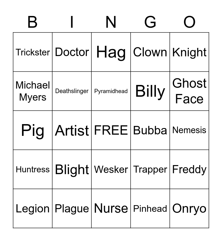 This bingo card has a free space and 27 words: Trapper, Bing Bong, Billy, Nurse, Michael Myers, Hag, Doctor, Huntress, Bubba, Freddy, Pig, Clown, Legion, Plague, Ghost Face, Oni, Deathslinger, Pyramidhead, Blight, Trickster, Nemesis, Pinhead, Artist, Onryo, Wesker, Knight and Skull Merchant.