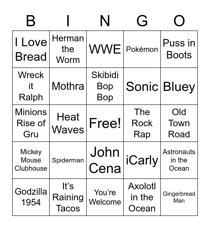 This bingo card has a free space and 24 words: Spiderman, It’s Raining Tacos, Skibidi Bop Bop, Godzilla 1954, Puss in Boots, I Love Bread, Wreck it Ralph, Herman the Worm, The Rock Rap, John Cena, Sonic, Minions Rise of Gru, iCarly, Astronauts in the Ocean, Mothra, Axolotl in the Ocean, Old Town Road, WWE, Bluey, Heat Waves, Gingerbread Man, Mickey Mouse Clubhouse, Pokémon and You’re Welcome.